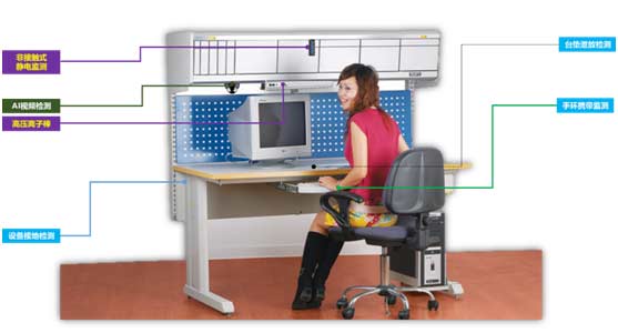 在線防靜電檢測系統(tǒng)包含方靜電設(shè)備(防靜電臺(tái)、雙回路手環(huán))、靜電安全接地系統(tǒng),光電檢測系統(tǒng)、在線監(jiān)測儀以及看板系統(tǒng)、聲光報(bào)警等設(shè)備與軟件組成,通過有線或無線網(wǎng)絡(luò),將前后臺(tái)連接起來,實(shí)現(xiàn)真正意義上的實(shí)時(shí)監(jiān)控、數(shù)據(jù)儲(chǔ)存、以及動(dòng)態(tài)顯示等功能,從而解決以往靜電防護(hù)過程記錄空缺、監(jiān)管難問題。通過結(jié)構(gòu)化的設(shè)計(jì)將相關(guān)的電子檢測設(shè)備和設(shè)備臺(tái)完整結(jié)合,達(dá)到美觀、整潔以及一體化的目標(biāo)。