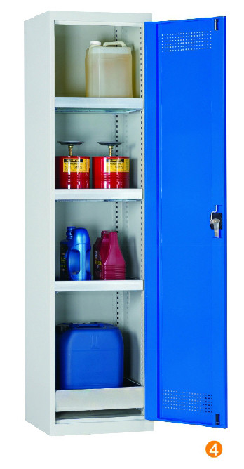 用于污染液體的存儲,可調(diào)式隔板,上下25mm可調(diào) 可移動式底部貯存盤高100mm,無縫焊接,更好防泄漏 門板的頂部及底部帶通風(fēng)孔,自然通風(fēng),門開啟角度12。 隔板/貯存盤式層板每層最大承重60KG (可抽出式除外) 柜體最大承重承重:300KG