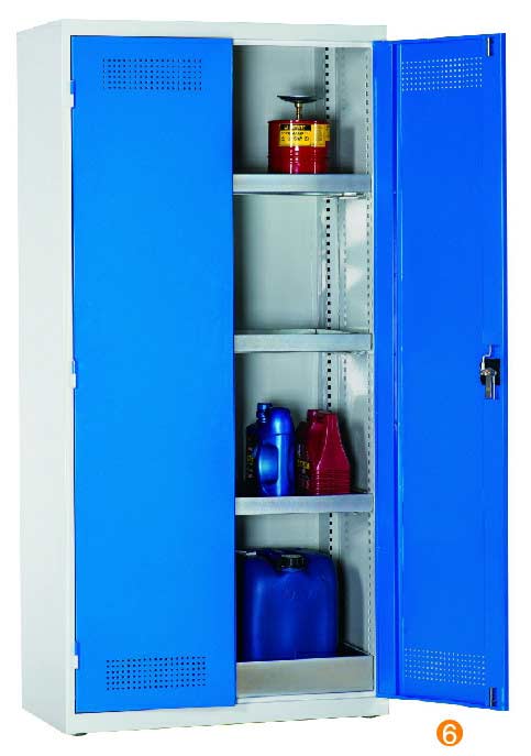 用于污染液體的存儲(chǔ),可調(diào)式隔板,上下25mm可調(diào) 可移動(dòng)式底部貯存盤高100mm,無縫焊接,更好防泄漏 門板的頂部及底部帶通風(fēng)孔,自然通風(fēng),門開啟角度12。 隔板/貯存盤式層板每層最大承重60KG (可抽出式除外) 柜體最大承重承重:300KG